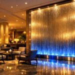 高級スパのラウンジに設置されたウォーターウォールと間接照明が調和するラグジュアリーな内装デザイン